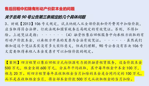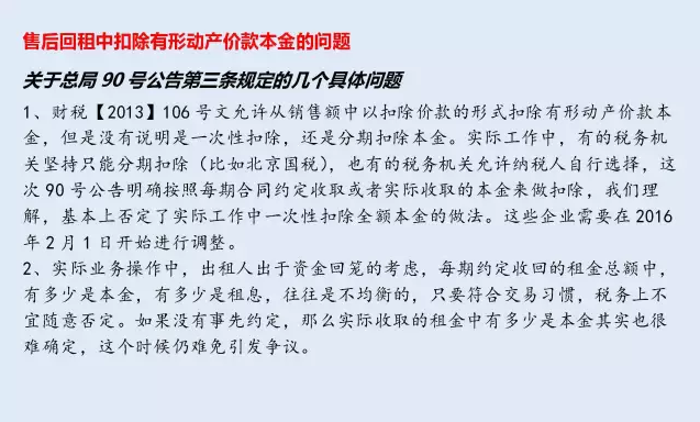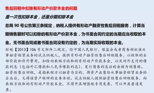 90號(hào)公告第三條規(guī)定,納稅人提供有形動(dòng)產(chǎn)融資性售后回租服務(wù),計(jì)算當(dāng)期銷售額時(shí)可以扣除的有形動(dòng)產(chǎn)價(jià)款本金,為書面合同約定的當(dāng)期應(yīng)當(dāng)收取的本金。無書面合同或者書面合同沒有約定的,為當(dāng)期實(shí)際收取的本金。